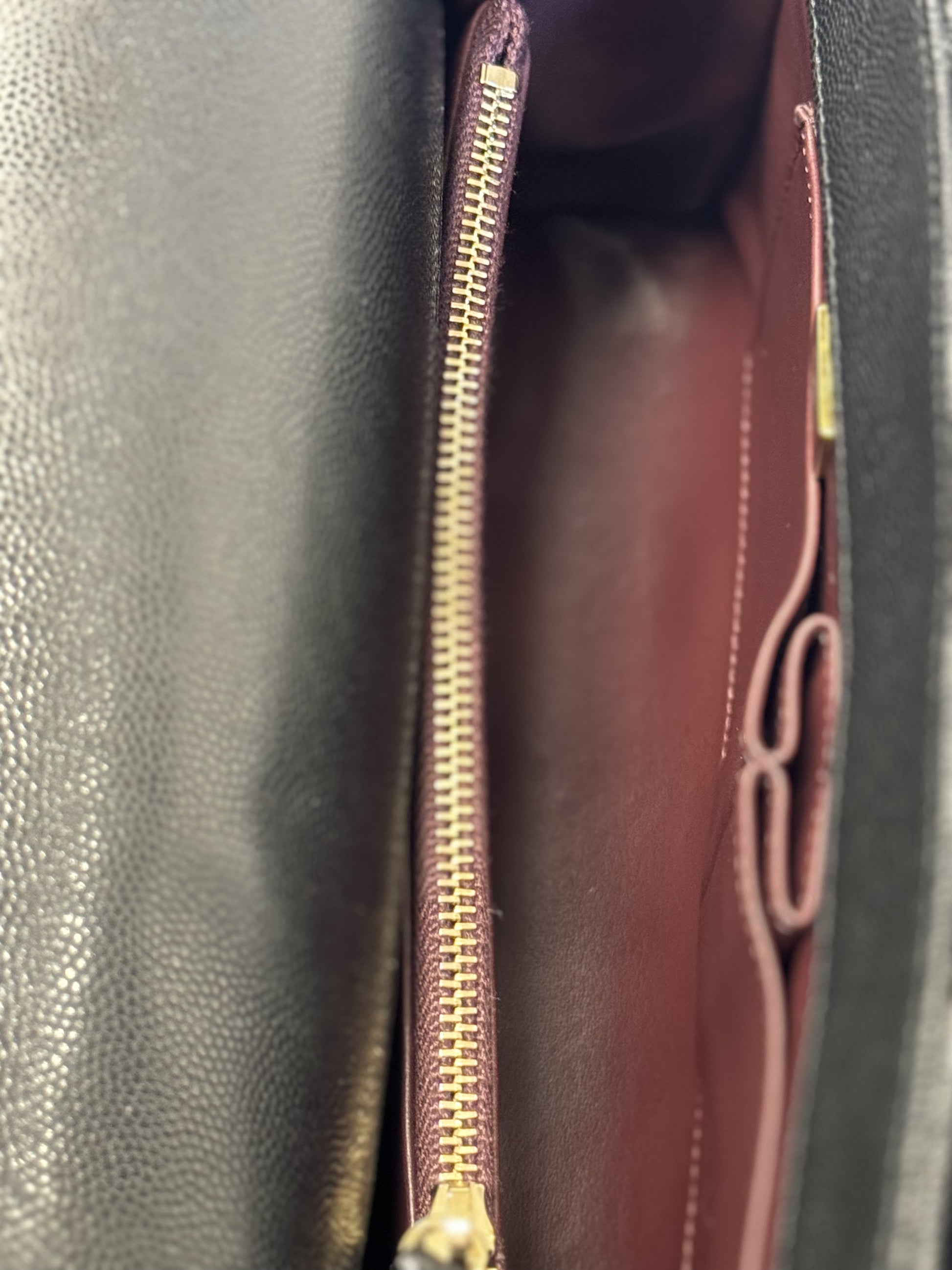 CHANEL Caviar Quilted Medium Coco Handle Flap in Black. This sleek, classic tote is crafted of diamond-quilted caviar leather in black. The shoulder bag features a black leather top handle, a rear patch pocket, a leather threaded gold chain-link shoulder strap with a leather shoulder pad, and a gold CC turn-lock closure. This opens the half flap to a partitioned burgundy leather interior with zipper and patch pockets.
